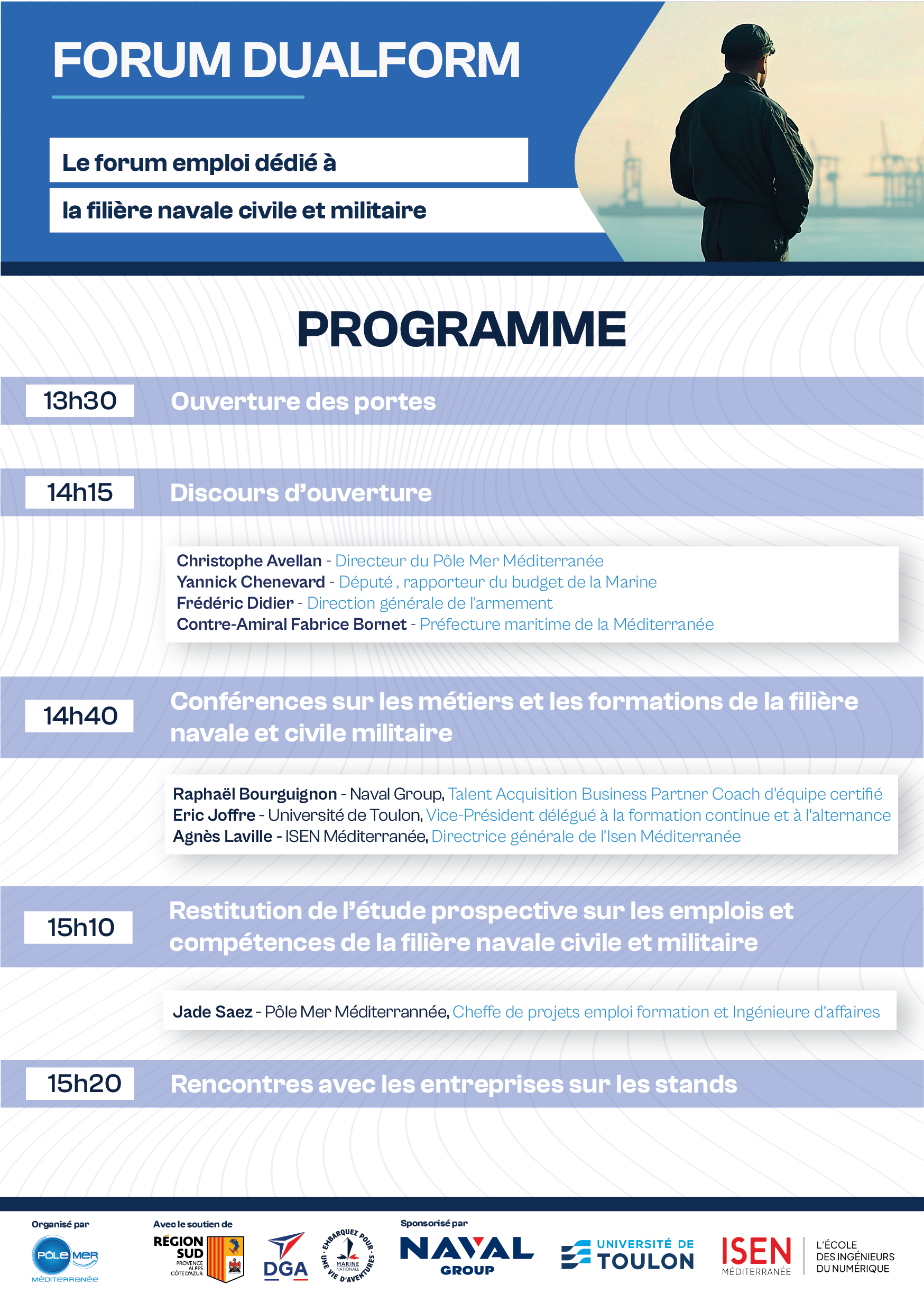 Le Pôle Mer Méditerranée, avec le soutien de la Région Sud et de la Direction Générale de l’Armement (DGA), pilote une action intitulée DUALFORM, visant à accompagner la structuration des compétences dans la filière navale civile et militaire.