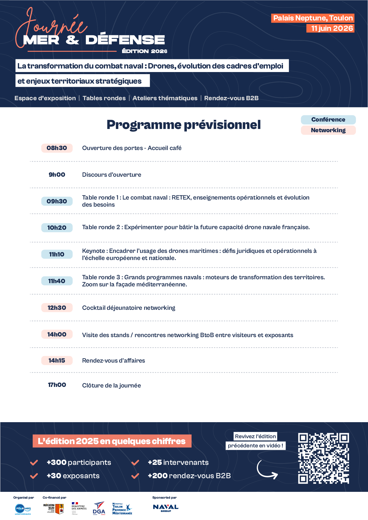 Une journée au cœur de l’industrie méditerranéenne maritime de défense, dédiée aux échanges, aux rencontres business et à l’innovation au service des enjeux maritimes duals.