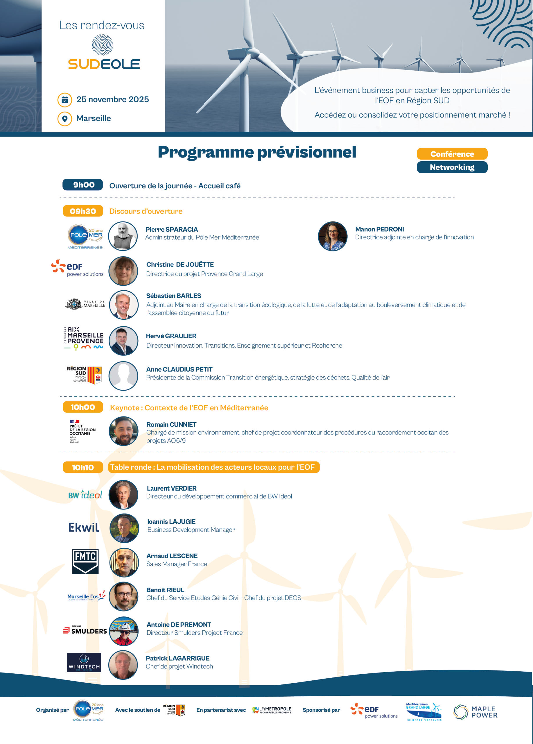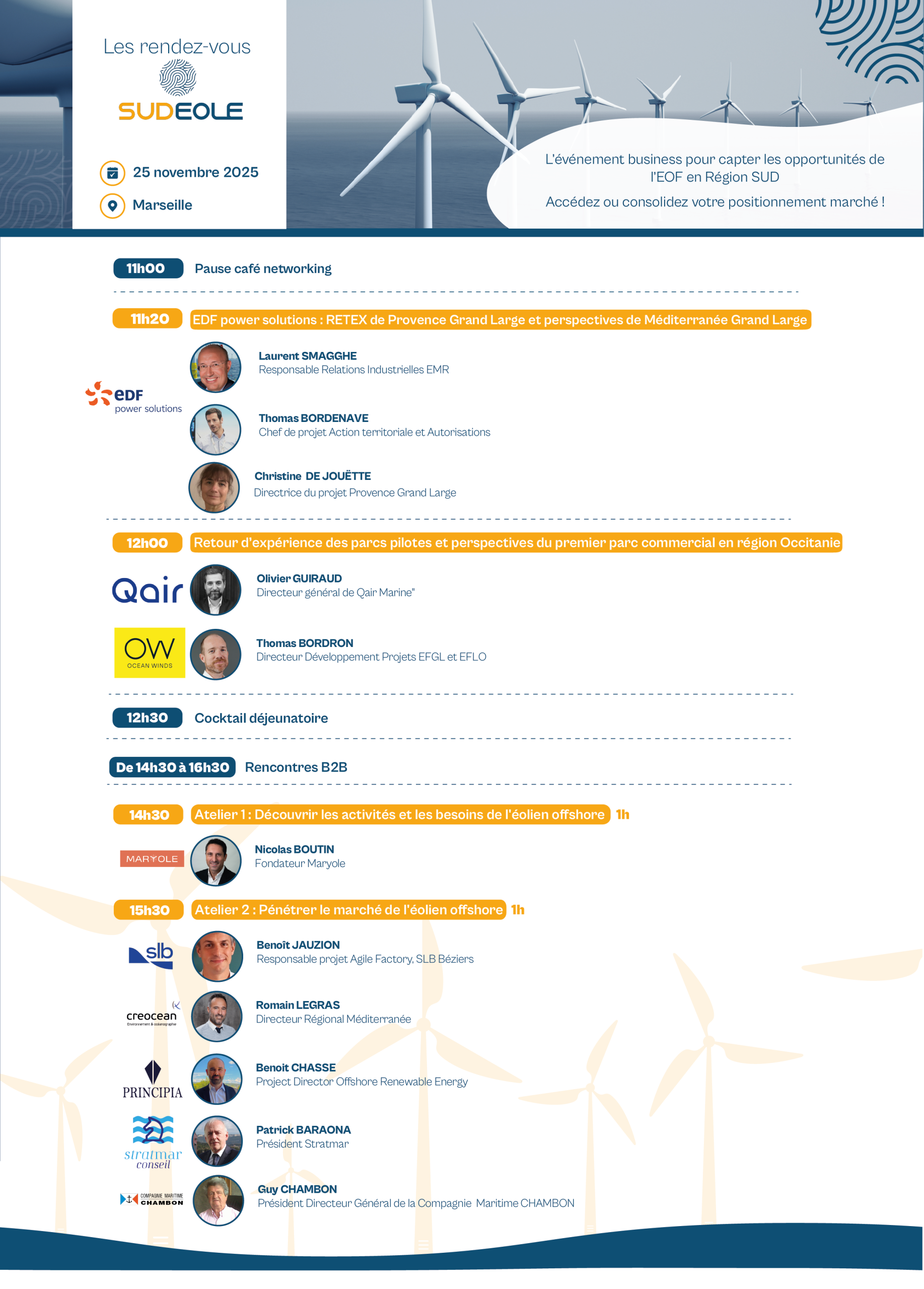 Sudeole, l’action territoriale pour la filière de l’éolien offshore flottant en région Sud, vous propose de participer durant la journée du 25 novembre 2025 à Marseille à un évènement axé sur les projets éoliens en mer et leurs opportunités.