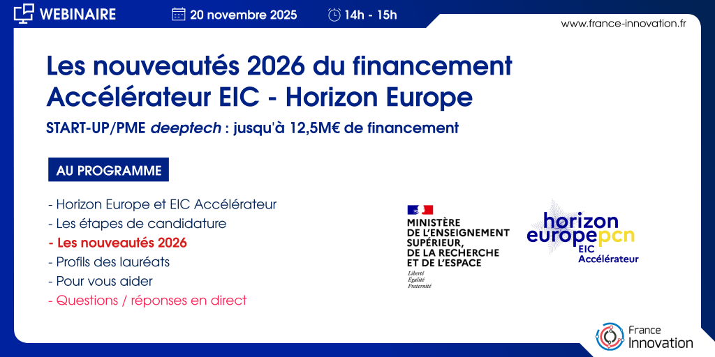 L’équipe des Points de Contact Nationaux (PCN) du programme de financement européen European Innovation Council (EIC) vous invite à participer au Webinaire EIC Accélérateur 2026, le jeudi 20 novembre de 14h00 à 15h00.